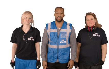 Three smiling KLM aviation team members, including two women and one man, proudly pose with their tools, ready for maintenance work.