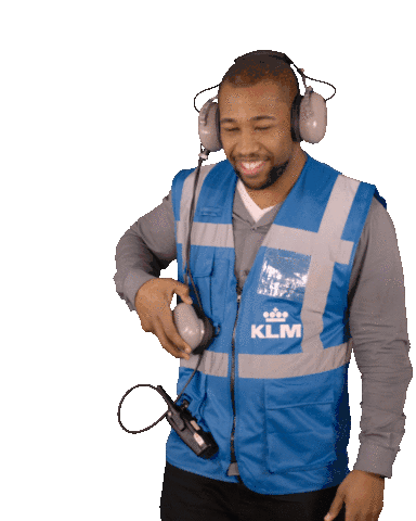 A smiling KLM ground crew member, wearing a high-vis vest and headphones, communicates using a radio.