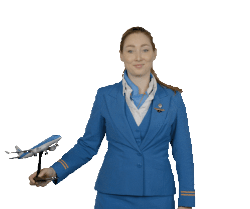 A smiling KLM flight attendant in her blue uniform proudly displays a model airplane, representing the Dutch airline.
