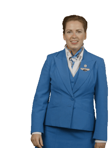 A friendly KLM flight attendant in uniform smiles and gives a confident thumbs up, symbolizing excellent service and travel.