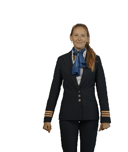 A smiling KLM pilot in uniform celebrates with raised fists, showing excitement and success.