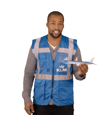 A smiling KLM crew member in a high-visibility vest holds a model airplane, points, and gives a thumbs-up.