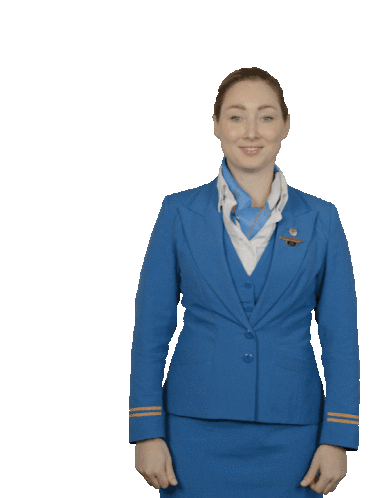 Smiling KLM flight attendant in blue uniform gives a double thumbs up, showing approval and positivity.
