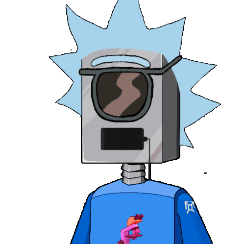 Animated sticker featuring a Rick-style robot with a screen displaying 'Kadena Mining Club' and 'KMC' logos.