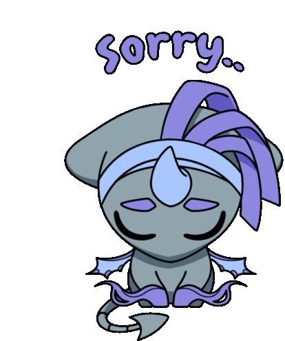 A cute Kmon Kryptomon character, with a sad expression, apologizes with tears and the text 'sorry..'.