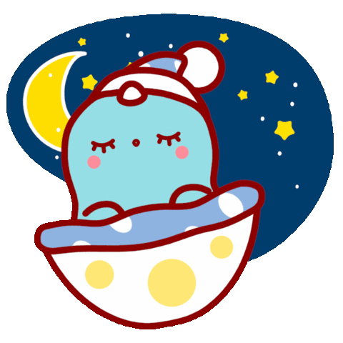 A cute, knackered character yawns and falls asleep in its bed under a starry night sky with a crescent moon.