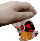 A hand gently holds a charming plush toy designed like a knife, featuring soft white fabric and bright red eyes.
