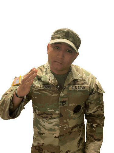 US Army soldier Thorne, wearing a camouflage uniform, performs a sharp knife hand gesture. Features the Pennsylvania Army National Guard logo.