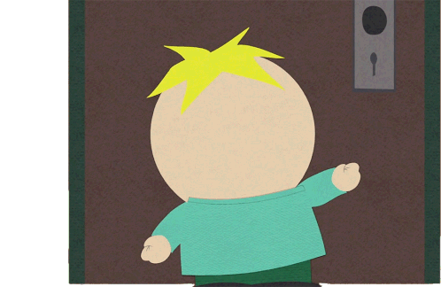 Butters Stotch from South Park knocks on a brown door, wanting to go inside. A classic moment.