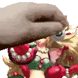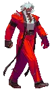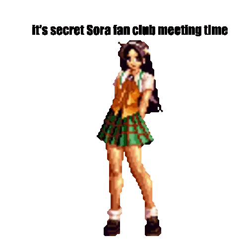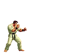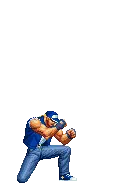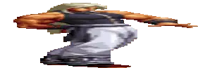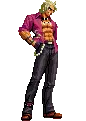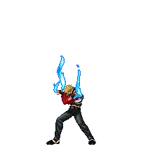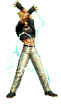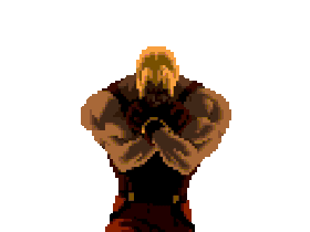 A pixel art character from King of Fighters (KOF) with arms outstretched, expressing triumph or power.