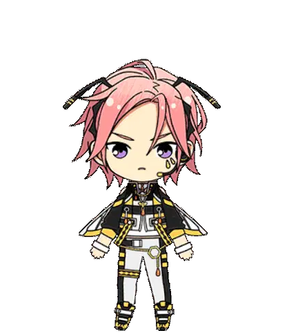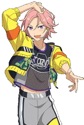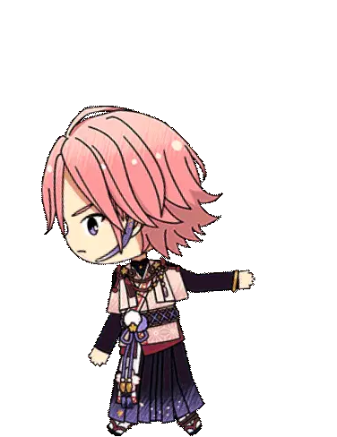 Animated sticker of Kohaku with pink hair and a black jacket, showing a smug expression and moving side to side.