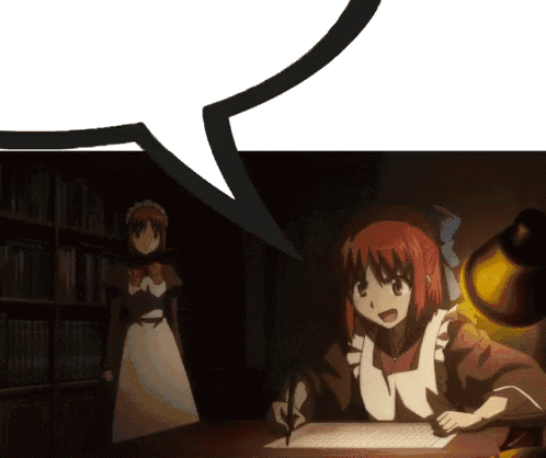 Kohaku from Tsukihime, dressed as a maid, diligently writing at a desk under a lamp, with another maid in the background.