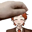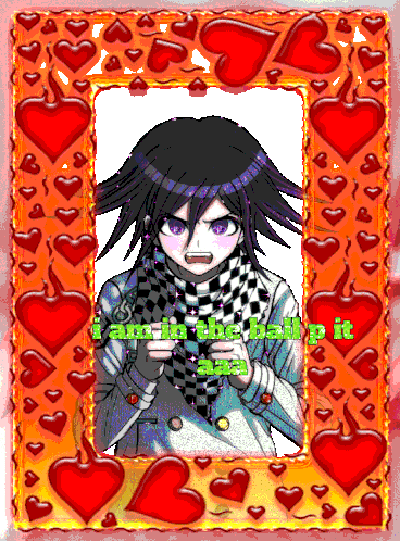 Kokichi Ouma from Danganronpa is framed by hearts, exclaiming "I am in the help it aaa" in a distressed, meme-like manner.