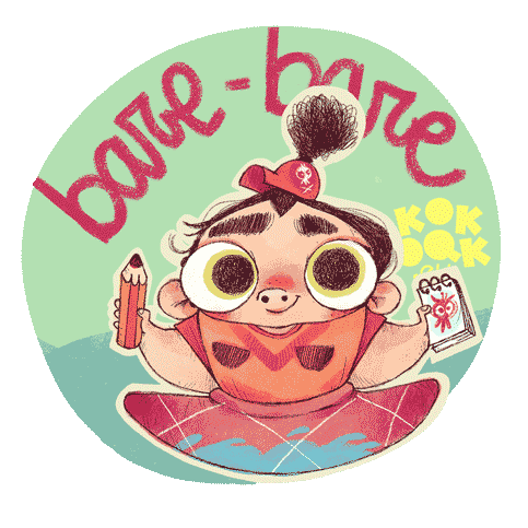 Kokoak Mugi Muki character drawing with a pencil and a book, featuring 'bare-bare' text and the KOK OOK .EUs logo.