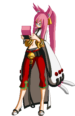 Kokonoe from Blazblue, a pink-haired character, engrossed in playing a handheld gaming device in pixel art style.