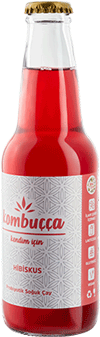 A vibrant red bottle of Kombuçça Kombucha with a white label, featuring the brand name and 'for myself' text.