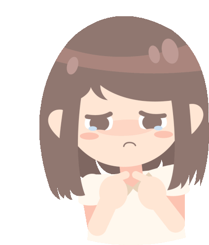An animated Komiktemanmu character, a cute girl, looks down with tears and clasped hands, expressing anxiety and sadness.