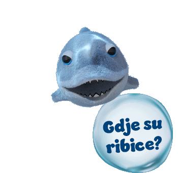 A plush shark puppet from Konzum Morsovci asks "Gdje su ribice?" (Where are the fish?), looking for its next meal.