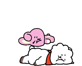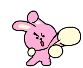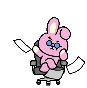 Koogimins Cooky, the pink rabbit character, gets frustrated and throws papers while sitting in an office chair, expressing anger.