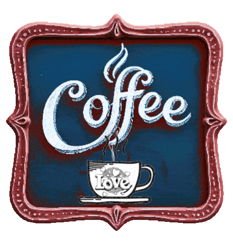 Decorative animated sticker featuring a framed sign with 'Coffee' in script, a cup with 'Love' and hearts, and rising steam, perfect for coffee lovers.