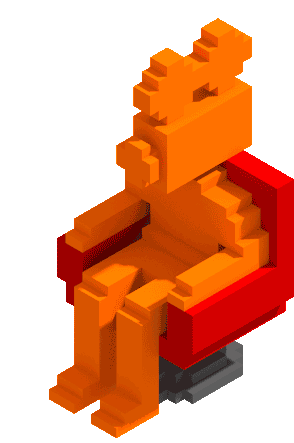 A rotating voxel art animation of a figure resembling a cameraman sitting in a chair, related to Kortfilmfestival Ikl.