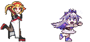 Koseki Bijou and Kaela Kovalskia in pixel art form, with Bijou standing and Kaela in motion.