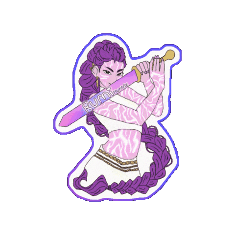 Kpopfan Rumi Huntrix, a demon hunter, holds a glowing purple sword with 'Rumi' inscribed, featuring unique arm markings.