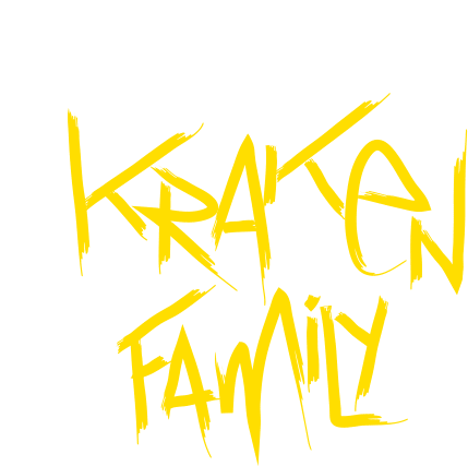 The vibrant, animated 'Kraken Family' logo by Alex Edwields, featuring bold red and yellow brushstroke text.