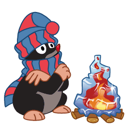 Krtek, the Little Mole, shivers in a hat and scarf next to an icy campfire, feeling the extreme cold.