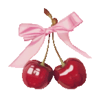 two cherries with a pink ribbon tied around them