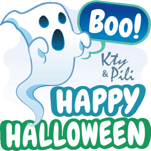A friendly ghost from KtyPili says 'Boo!' and wishes everyone a Happy Halloween with festive text.