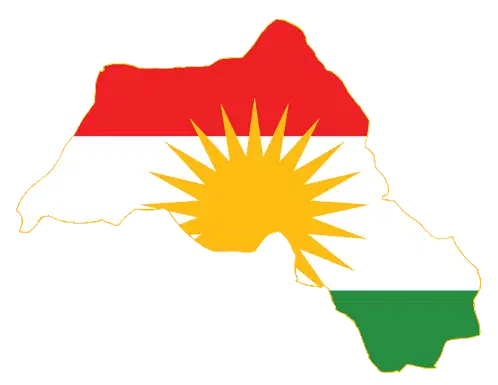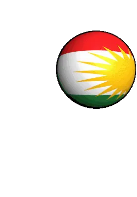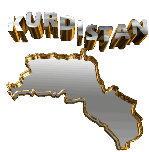 An animated 3D map of Kurdistan with a golden border and silver fill, featuring the word 'KURDISTAN' in 3D text above it.