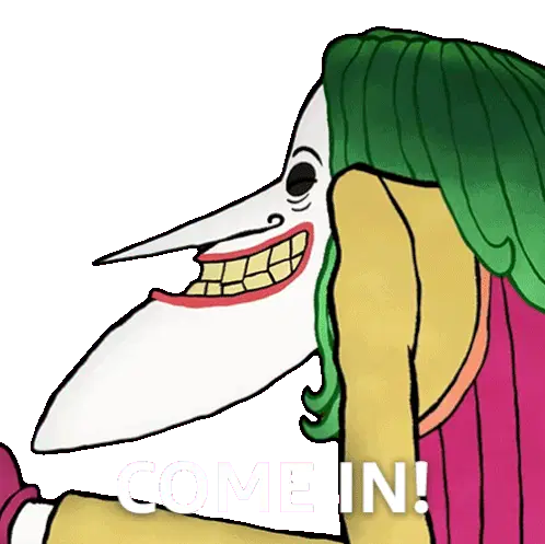 Animated sticker of Kuru Kururin, a cartoon jester with purple hair and a hat, smiling and holding a sword.
