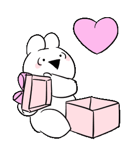 A cute white rabbit opens a pink gift box, revealing a floating pink heart, symbolizing love and happy surprises.