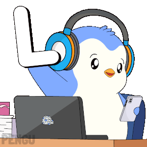 Pengu, the blue and white penguin, winks while wearing headphones, holding a phone, and sitting at a laptop.