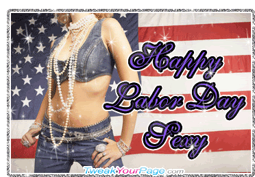 A woman in denim and pearls against an American flag background, wishing a 'Happy Labor Day Sexy' for Labor Day.