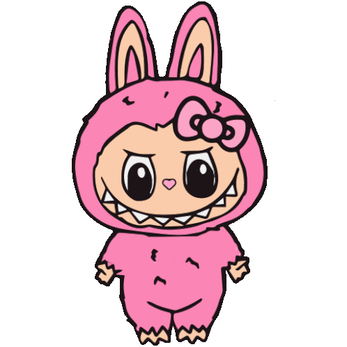 Adorable Labubu character in a vibrant pink bunny costume, featuring big ears, a bow, and a wide, toothy smile.