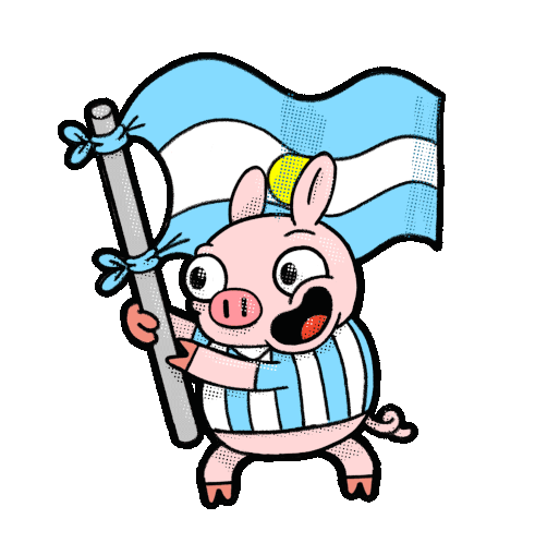 Laculpa Chanchito, the cartoon pig, enthusiastically waves the Argentinian flag, dressed in a football jersey.
