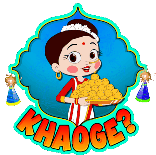 Chutki from Chhota Bheem offers laddoos with 'Laddoo Khaoge?' text, perfect for festive greetings.