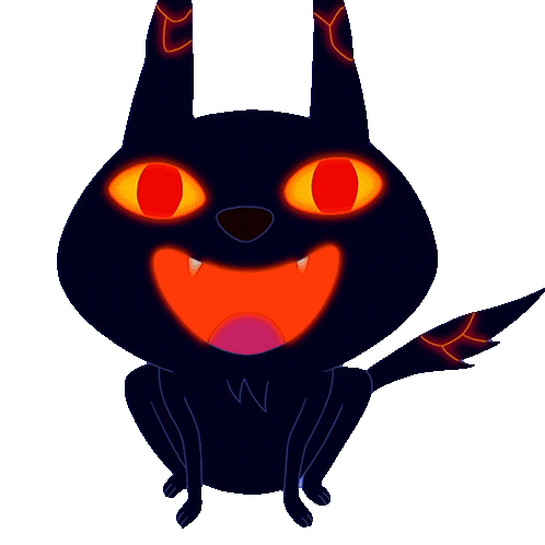 Animated black dog with glowing blue eyes and markings, barking energetically with its mouth open and tongue out.