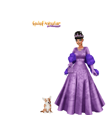 Lady Destiny, a regal woman in an ornate purple gown with fur accents, stands elegantly beside a charming corgi dog.