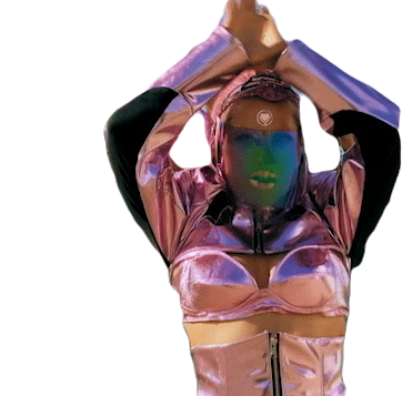 Lady Gaga strikes a powerful pose in her iconic pink and black futuristic costume from the Stupid Love era, hands raised.