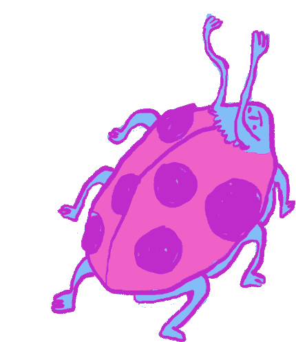 A cute pink ladybug with purple spots and blue limbs wiggles and dances happily. A fun animated insect sticker.