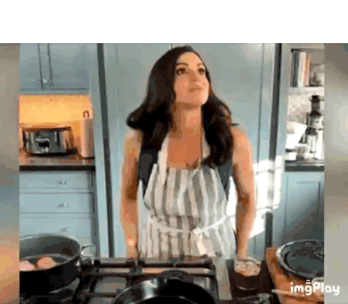 Lana Parrilla, as Regals, in a kitchen, looking up and then smiling at the camera while wearing a striped apron.