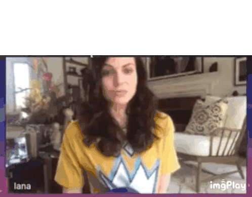 a woman in a yellow shirt is sitting in a living room with a chair .