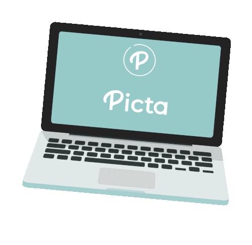 A light grey laptop displays a photo app with a picture of friends jumping on a beach, featuring the Picta logo.