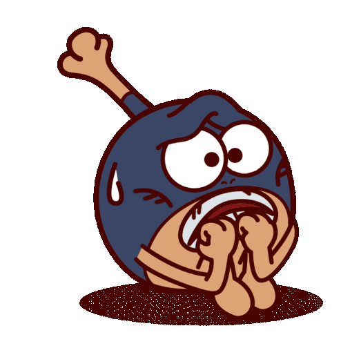 Larva character cowering in fear, shaking nervously with hands covering its face.
