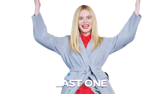 Elle Fanning celebrates with arms raised, a big smile, and a wink, indicating "LAST ONE" in a cheerful and energetic way.