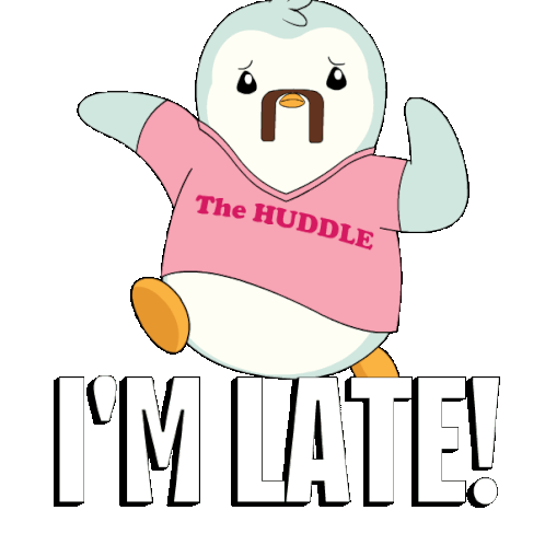 A worried Pudgy Penguin wearing a 'The Huddle' shirt declares 'I'M LATE!' in this animated sticker, perfect for showing you're behind schedule.