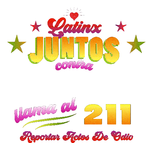 Vibrant sticker promoting 'Latinx Juntos Contra El Odio' (Latinx Together Against Hate), encouraging to 'Llama al 211' to report hate acts.